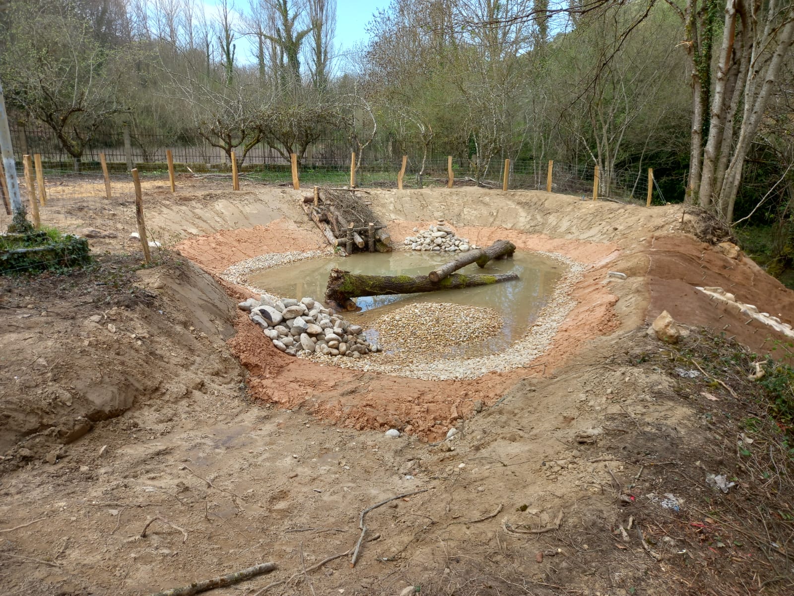 Anfibio gehienek bizi zikloa osatzeko kalitate oneko ur masa iraunkorrak behar dituzte. Apoen kasuan, gainera, babeslekuak behar dituzte, hala nola zuloak, zuhaixkak edo egur hila. Horregatik, diseinuan elementu naturalak sartu dira, besteak beste, altzairu korrugatuzko barrekin lotutako enbor gurutzatuak, ibai ibilguak mantentzeko lanetatik eratorriak, babesleku estrategiko gisa funtzionatzen dutenak. Erabiltzen ez zen ureztatzeko urmael zahar baten lekuan eraiki da putzu berria, ezkerreko ibaiertzean.