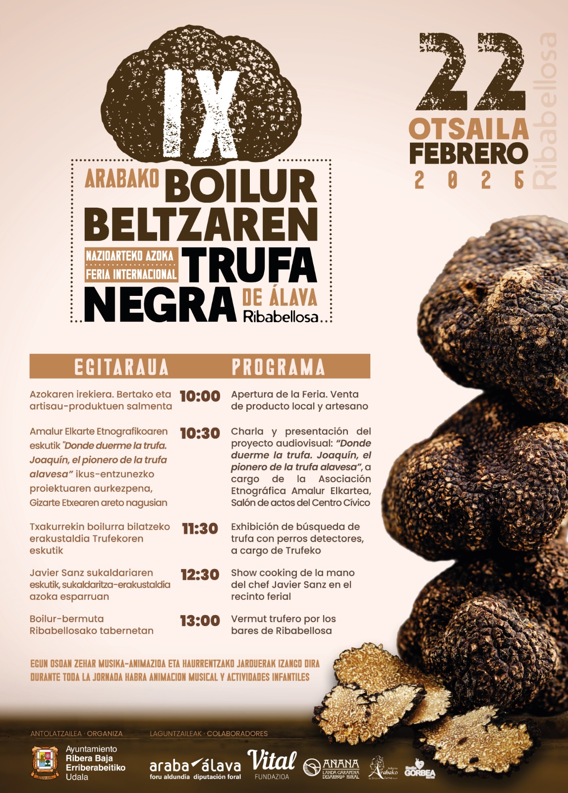 Goizean zehar hainbat jarduera izango dira. 10:30ean, Ribabellosako gizarte etxeko areto nagusian, Amalur elkarteak Donde duerme la trufa, Joaquín, el pionero de la trufa en Álava lana aurkeztuko du. Dokumentalak Barbastron (Huesca, Espainia) jaiotako Joaquinen bizipenak kontatzen ditu; hark hiru hamarkada baino gehiago eman zituen Arabako mendietan boilurrak biltzen, gaur egun hain preziatua den produktu hau bizirauteko baliabide ekonomiko garrantzitsua zen garaian.