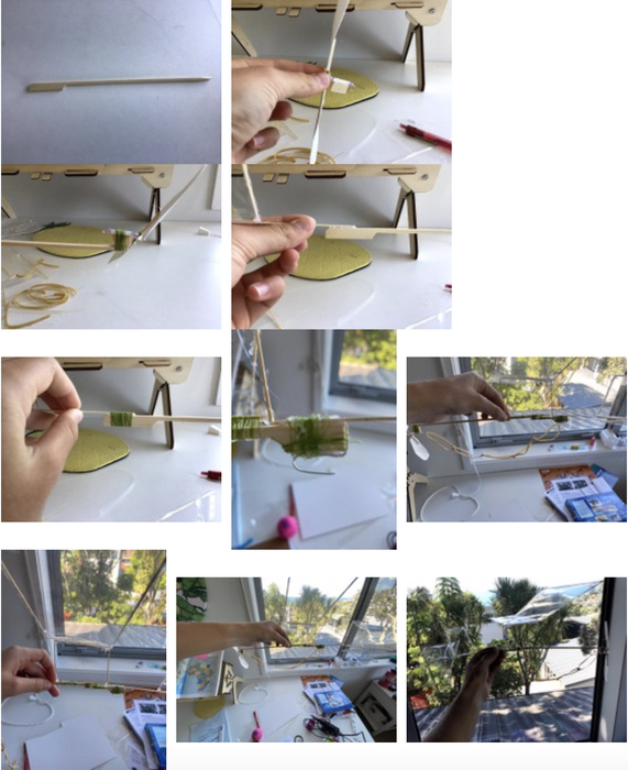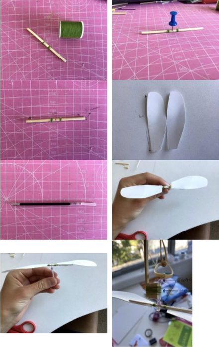 6- Jarri dena batera. Lehenik, makilari punta zorrotza moztu, eta ebaki boligrafoaren zati plastikoaren zati bat helizearen ardatzean. Moztu ondoren, itsatsi egur-zatia boligrafoaren plastiko-zatiaren gainean. Ondoren, atera beste pintxo bat, moztu punta eta itsatsi helizea gainean. Bi zatiak ondo lotuta daudela ziurtatzeko, gehitu hari-geruza bat zatien inguruan.