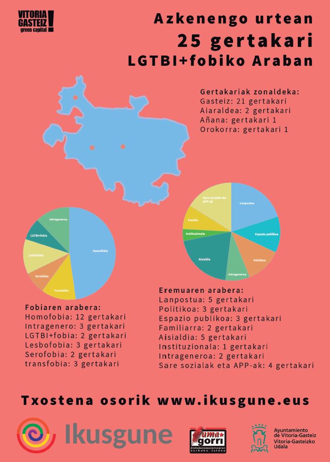 Hogeitabost "gertakari" zenbatu dituzte iragan urteko maiatzetik aurtengo apirilera arte Gasteizko LGTBI+fobiaren aurkako behatokian. Jasotako salaketen %85 hiriburuan gertatu dira: 21 Gasteizen, 2 Aiaraldean, beste bat Añanan, eta beste bat zehaztu gabe; biktima gehienak gazteak dira, 30 urtetik beherakoak hain zuzen; eta eraso gehien gertatzen diren urtaroa uda da (%40).