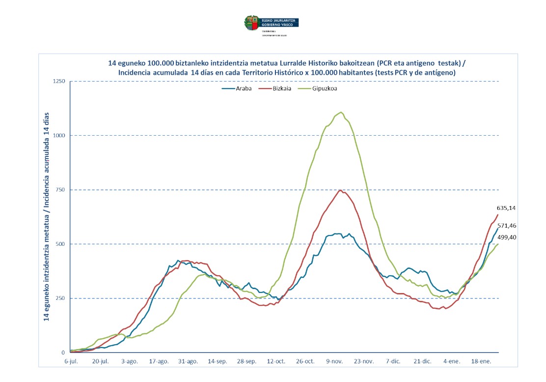 EAEko ospitaleen egoera orokorrari dagokionez, datuak gero eta kezkagarriagoak dira. Asteartean, 15.837 test diagnostiko egin ziren; horietatik 1.104 positiboak izan ziren (%7).