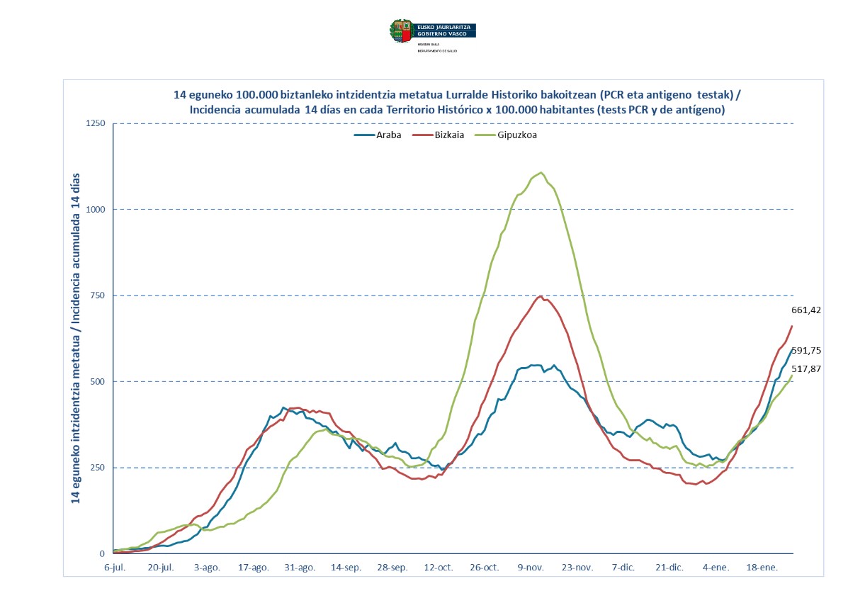 Araba osoa eremu gorrian jarraitzen du asteburutik. Gainera, azken 24 orduetan, 186 positibo berri atzeman dira lurraldean, eta intzidentzia tasa metatua 591,75ekoa da une honetan. Kasu horietako 143 Gasteizen atzeman dira, eta hiriburuak dagoeneko gainditu du 600 kasuko intzidentzia tasa metatuaren langa; zehazki, 610,27koa da une honetan.