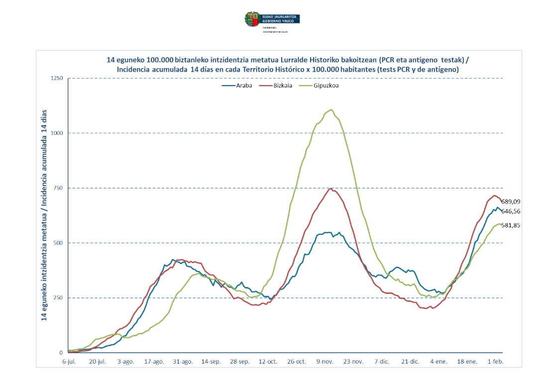 Arabako intzidentzia tasa metatuak behera egin du: une honetan 646koa da, eta azken 24 orduetan 151 positibo berri atzeman dira lurraldean. Azken eguneko joera mantenduz, lurraldeko intzidentziaren hazkundea egonkortzen edo gelditzen hasi da; horrela, pandemiaren hirugarren olatuaren balizko amaierara iristen ari garela ondorioztatu daiteke.