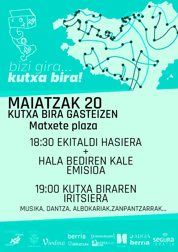 Arabako beste hainbat herriren artean, Kutxa Bira maiatzaren 20an igaroko da Arabako hiriburutik. 18:30etik aurrera, Hala Bedik irratsaio berezi batekin berotuko du Matxete plaza; 19:00etan kutxa iritsiko da, eta, besteak beste, musika, dantzariak, albokariak eta zanpantzarrak izango dira ekitaldian.