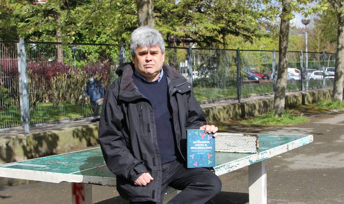 Juan Ibarrondo, 'Anticuerpos contra el neoliberalismo' liburua eskuan. / Erlantz Anda