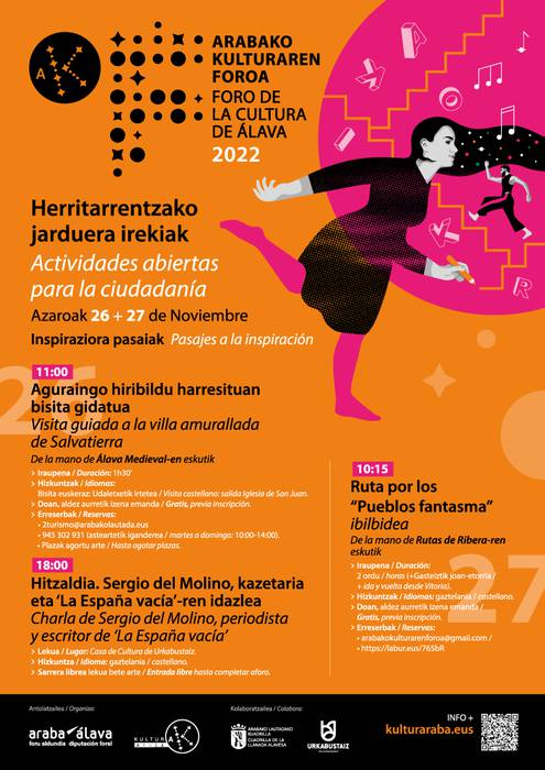 Foroaren osagarri moduan, Aldundiak herritarrei irekita egongo diren eta doakoak izango diren hiru jarduera antolatu ditu azaroaren 26 eta 27an. Larunbatean, hilaren 26an, jardunaldia 11:00etan hasiko da Agurain hiribildu harresitura egindako bisita gidatuarekin. Arratsaldean, aldiz, Sergio del Molinok, La España Vacía lanaren idazle eta kazetariak, solasaldia eskainiko du. Eta igandean, hilaren 27an, 10:15ean, Rutas de Riberak Ruta por los pueblos fantasma izenekoa eskainiko du.