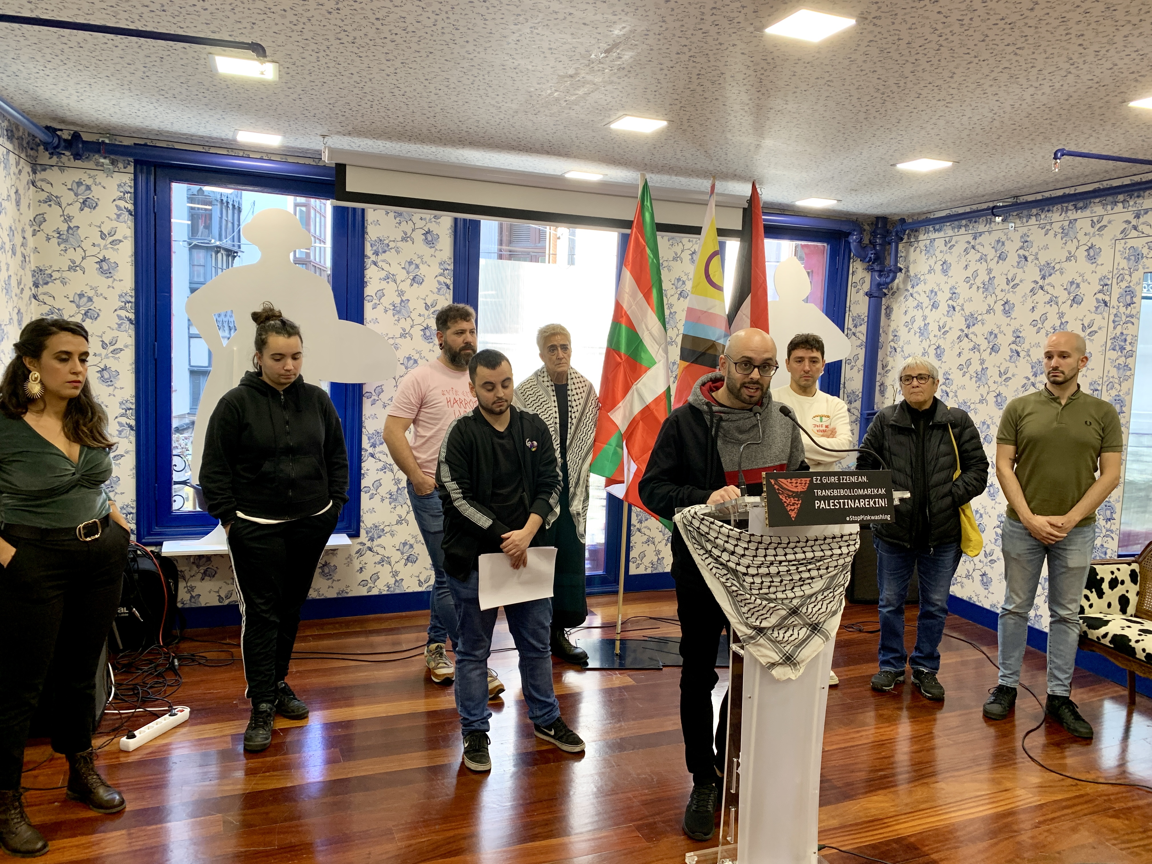 LGTBI komunitateko kideek agerraldia egin dute Palestinari elkartasuna adierazi eta Israelen ekintzak salatzeko, ehun lagunek sinatutako adierazpenarekin bat. Gainera, egunotan antolatzen ari diren manifestazioetan parte hartzeko deia egin diote kolektiboari.