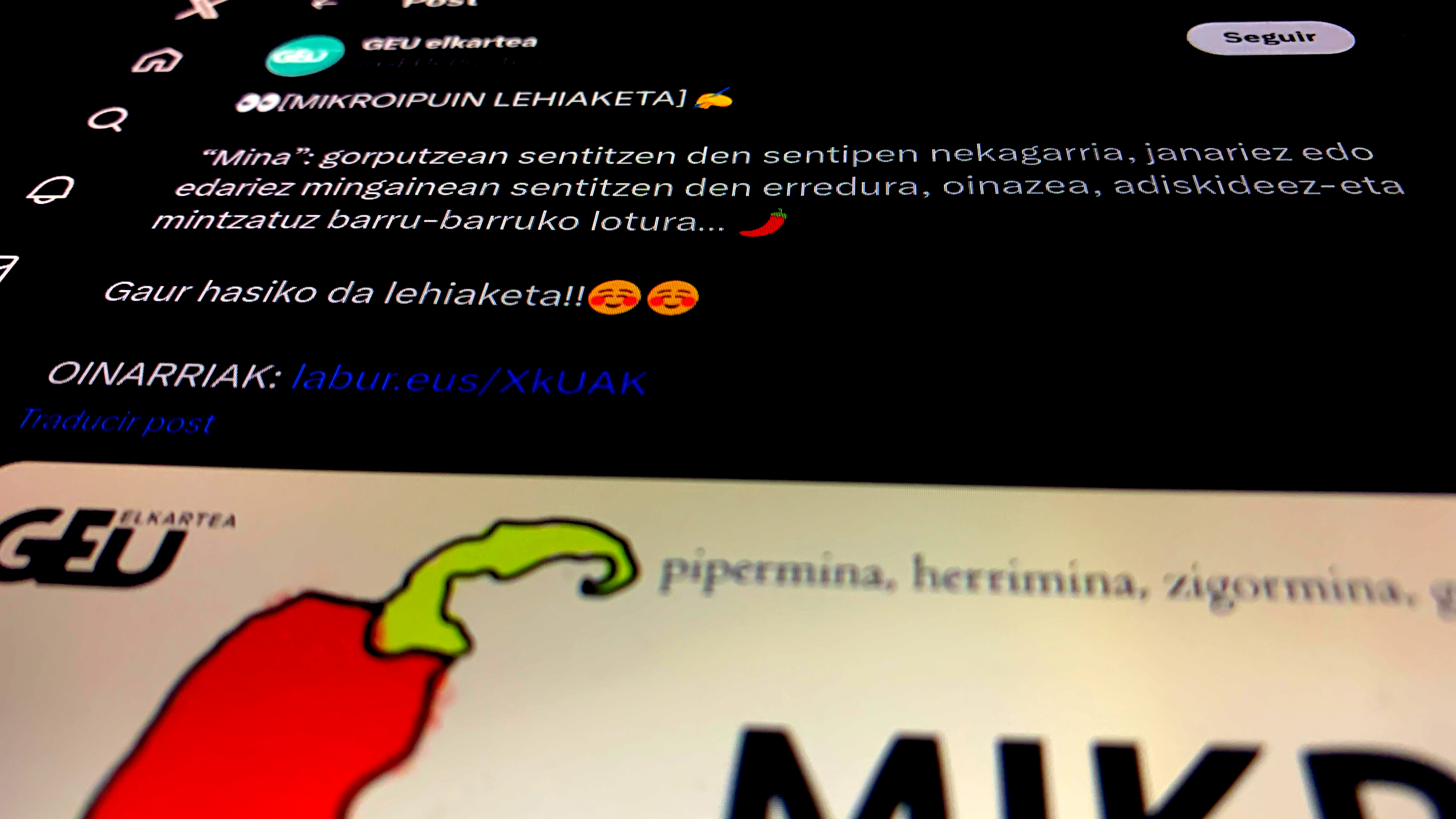 Mikroipuin lehiaketaren bosgarren edizioak mina izango du gai nagusitzat, eta parte hartzeko epea atzotik irekita dago. GEU elkarteak antolatzen duen lehiaketan parte hartzeko X sare soziala erabili beharko da. Hala, antolatzaileek dei egin dute hitz horretatik abiatu eta horrekin jolasteko.