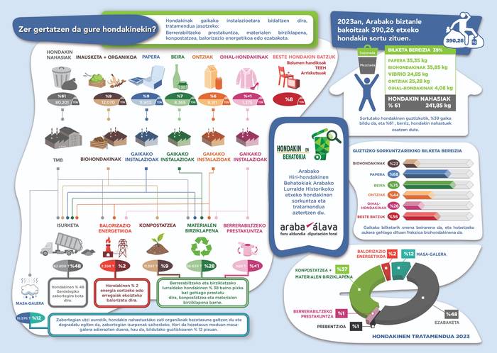 Zehaztu duenez, murrizketa hori %5ekoa da, eta "hondakinen sorreran izandako murrizketa hori Barne Produktu Gordinaren igoerarekin kontrastatzen bada, ikusten da ekonomiaren aurrerapenaren eta hondakinen sorreraren artean desakoplamendua gertatzen ari dela". 2023an, 131.395 tona hondakin sortu dira lurraldean, hau da, 390,26 kilo biztanleko, "eta azken 10 urteetako baliorik txikiena da hori", azpimarratu du.