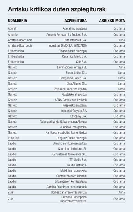 Arriskua, batez ere, Zadorra eta Ebro ibaiertzetan kontzentratzen da, Gasteizko eta Erriberabeitiko industrialdeetan, eta Aiaraldean, Nerbioiko industria ardatzean. Uholde arrisku kritikoan hainbat industria identifikatu dituzte, hala nola Industrias Galycas, Lascaray edo Laminaciones Arregui Gasteizen, eta Guardian Llodio eta JEZ Sistemas ferroviarios Laudion.