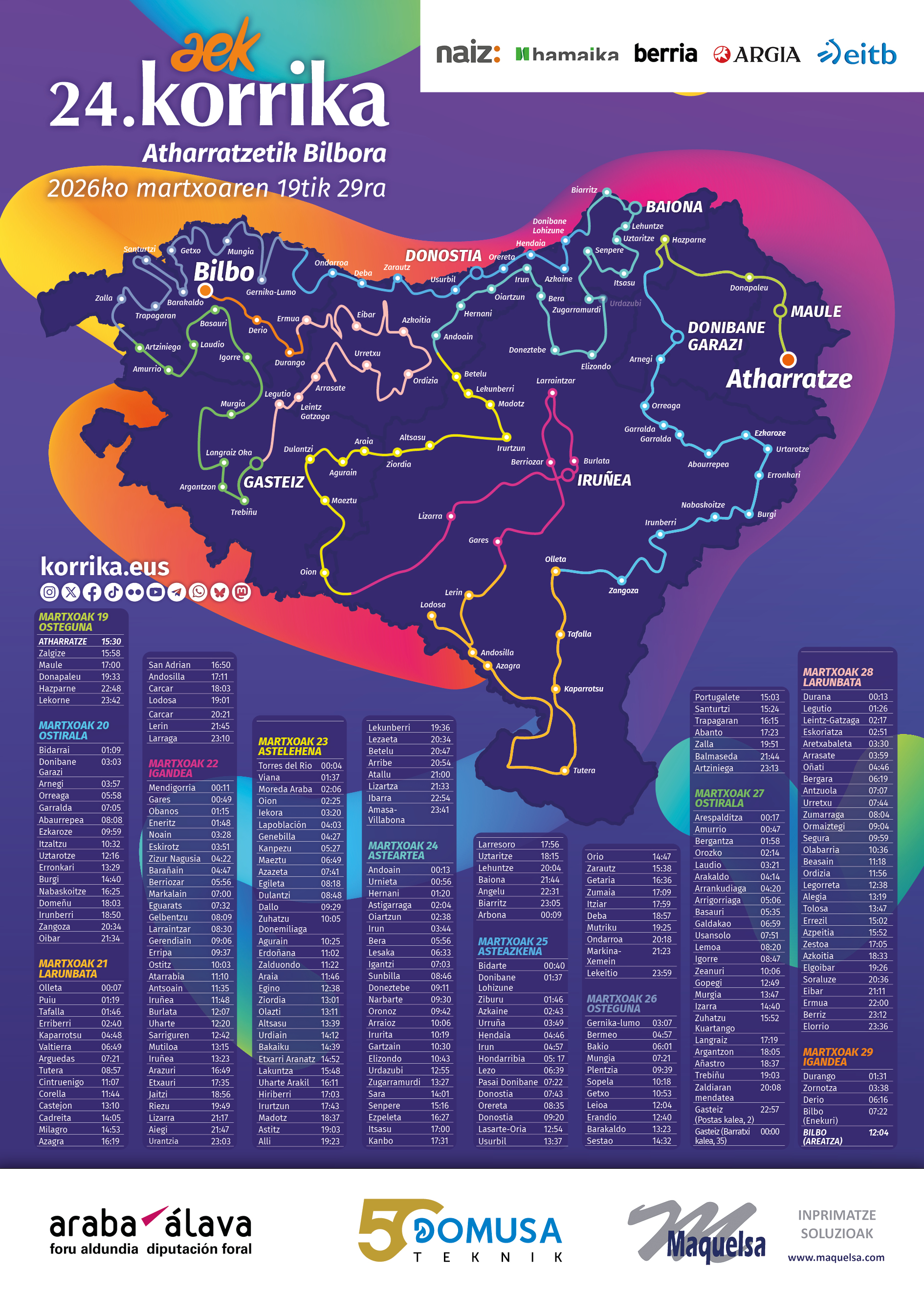 Araban hiru sartu-irteera nagusi egingo ditu 24. Korrikak, gaur AEK-k ezagutzera eman duen ibilbideari jarraiki. Jakina denez, Atharratzetik aterako da aurtengo edizioa, martxoaren 19an, eta 29an Bilbora iritsiko da, bertan amaiera ekitaldia egiteko.