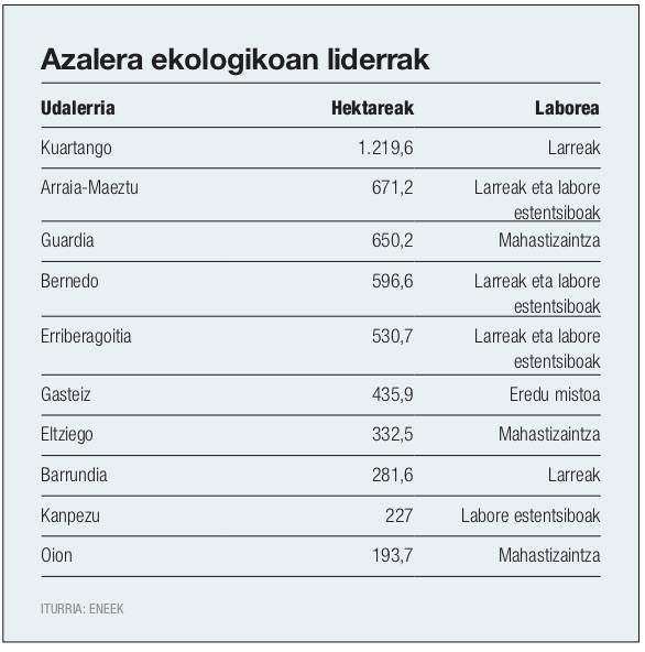 Bizkaia eta Gipuzkoaren parean, Araba da ekologikoan nekazaritza lur gehien duena, 7.514 hektarea; herrialdeko nekazaritza lurren %6,7. Ekolurrak emandako datuen arabera, ekologikoaren buru diren udalerriak Kuartango eta Arraia-Maeztu dira, Arabako azalera ekologikoaren liderrak. Eta biek ezaugarri komun bat dute: larreen eta belardien garrantzia.