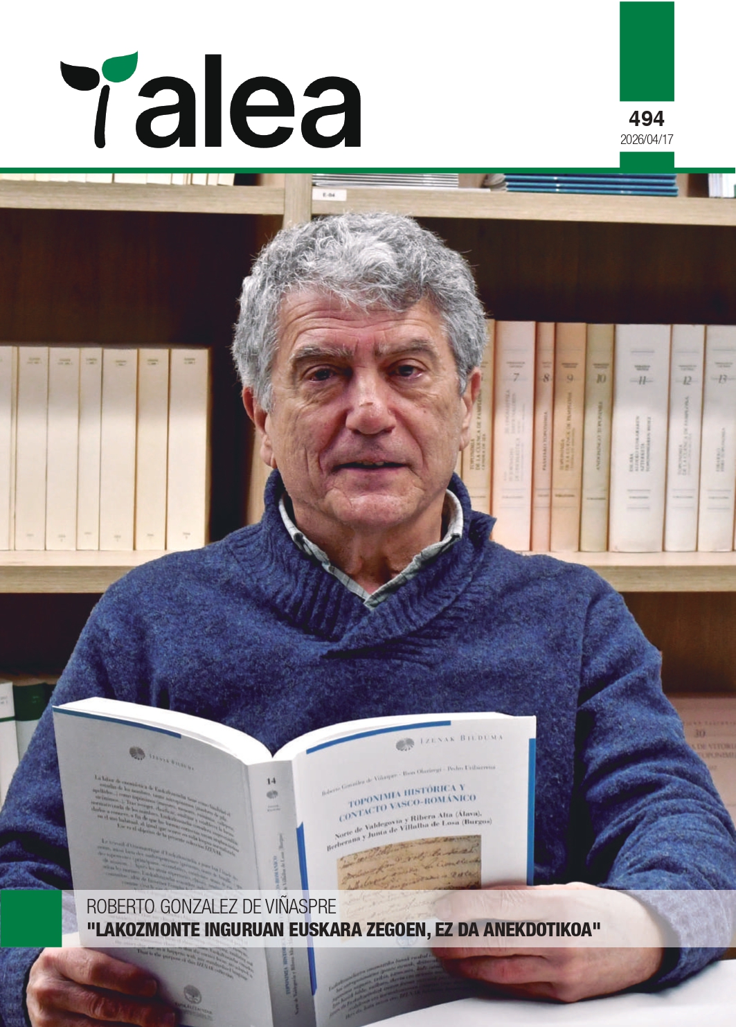 - PROTAGONISTA. Roberto Gonzalez de Viñaspre, Arabako Euskaltzaindiko ordezkaria: "Euskarazko izenen intentsitate handiena Losan aurkitu dugu". Gaubeako eta Erriberagoitiko iparraldea eta Burgosko Berberana eta Villalba de Losako toponimia historikoa aztertu dute roberto Gonzalez de Viñasprek, Ibon Olaziregik eta Pedro Uribarrenak. Artxiboak sakon ikertu dituzte eta ahozko tradizioa arakatu dute. Euskara eta erromantzearen hiztunak aurkitu dituzte.