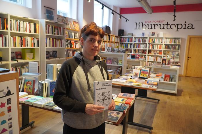 Gasteizko Eva Forest Liburutopia liburu dendatik, Hirune Tobajasek Danele Sarriugarteren Beste zerbait (Consonni) gomendatu du, eta lanaren estilo berezia eta euskararen aldeko hautu politikoa azpimarratu ditu. "Kalean erabiltzen den euskara jasotzen du, eta horren inguruko azalpen bat ere ematen du, hizkuntza biziak denborarekin nola moldatu eta egokitzen diren". Zapalkuntza desberdinen pasarteak, irakurketa feministak, ahots eta tonu desberdinak jaso ditu Sarriugartek ezohiko nobela honetan. "Liburuari etiketa bat jartzea ezinezkoa da, 'beste zerbait' baita, tituluak berak esaten duenez", aipatu du Tobajasek. Liburutopian bertan aurkeztu zuen idazleak liburua, eta bertako irakurle txokoan ere parte hartu zuen. Izan ere, poliki-poliki, komunitate sendoa osatzen ari dira Alde Zaharreko liburu dendan, aurkezpen, tailer eta bestelako jarduerekin. "Ematen du, batez ere, neguan goxo egoteko txokoa dela hau, eta gehiago kostatzen zaio jendeari uda partean...". Halere, eskaintzarik ez da falta, eta gonbita hortxe; maiatzean, besteak beste, 'Silueta' aurkeztuko du Harkaitz Canok, eta 'Zubia' Kepa Larreak.