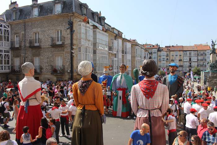 13:30 Erraldoi, buruhandi, zaldi eta txoten konpartsaren agurra San Prudentzio eta San Antonio kaleen arteko