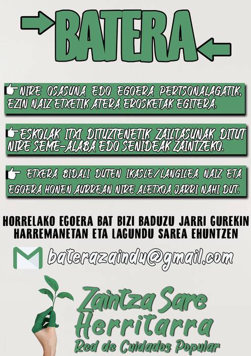 Aipatutako beharren bat duten pertsonentzat eta zaintza lanak eskaintzen laguntzeko prest dauden lagunentzat baterazaindu@gmail.com helbide elektronikoaren bitartez harremanetan jartzeko aukera zabaldu dute.