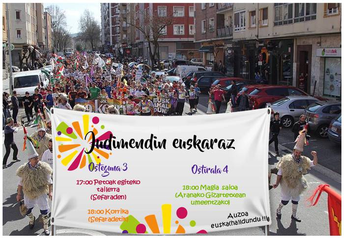 Abenduak 3 izango ditu ostegun honetan, eta, Euskararen Egunaren harira, Judimendiko eragileek bat egin dute, data berezi horretan hainbat ekintza antolatzeko; besteak beste, Judimendiko Gazte Asanblada, Sumendi Espazioa, auzoko aisialdi taldeak, kale hezitzaileak, Judimendikoak Auzo Elkartea eta auzoko AEK elkarlanean arituko dira ostegun eta ostiraleko arratsaldeetan.