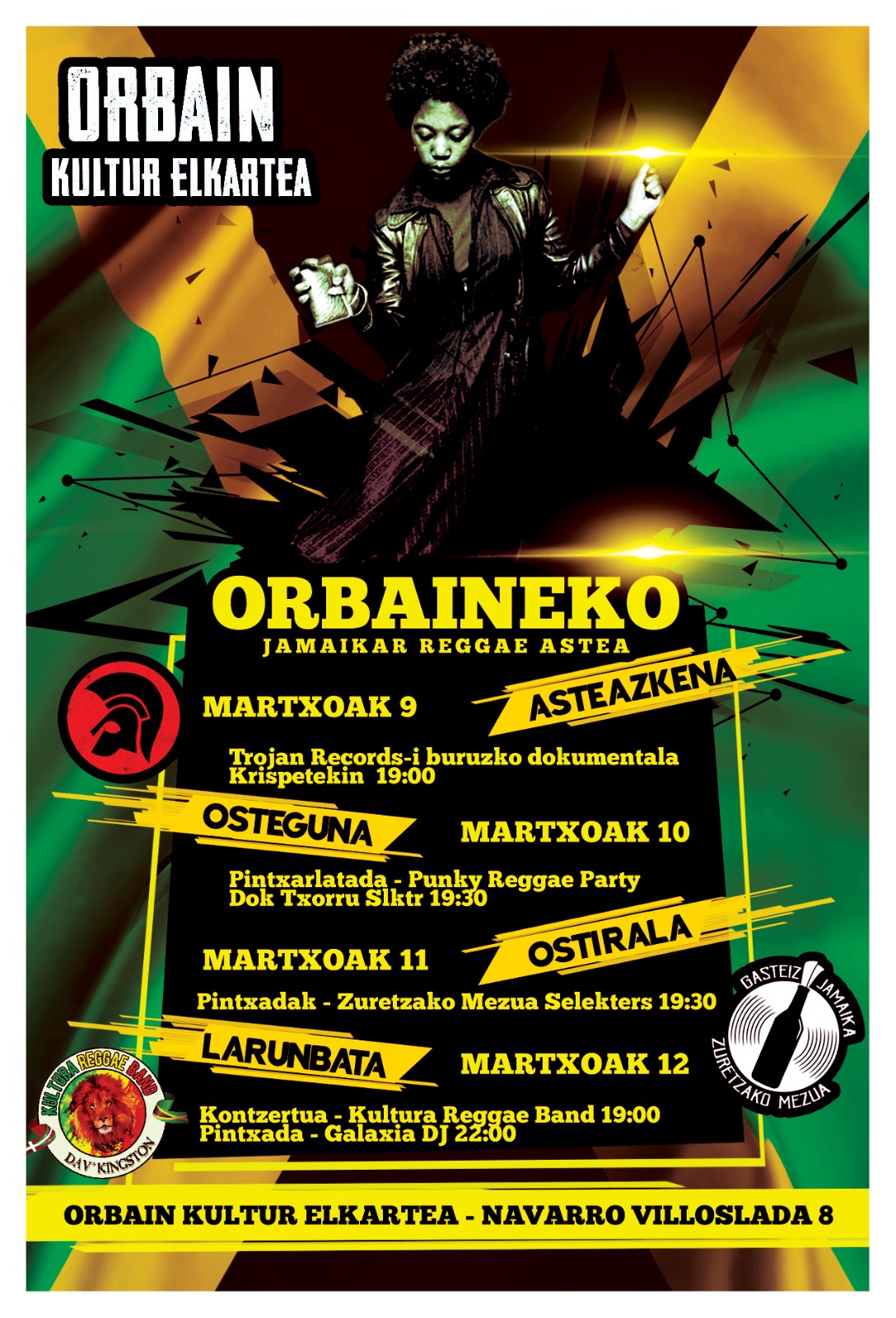 Gasteiz eta Jamaika. Punka eta reggaea. Ez dira inondik inora txanpon beraren bi aldeak, baina lotura estua izan dute azken hamarkadetan zehar, Potato taldeak abesten zuen Punki reggae party kantak argi utzi zuen bezala. Bi kontrakultura horien arteko elkarlana oinarri, Orbain Kultur Elkarteak Reggae Astea antolatu du aste honetarako, Zuretzako Mezua reggae kolektibo gasteiztarrarekin batera.