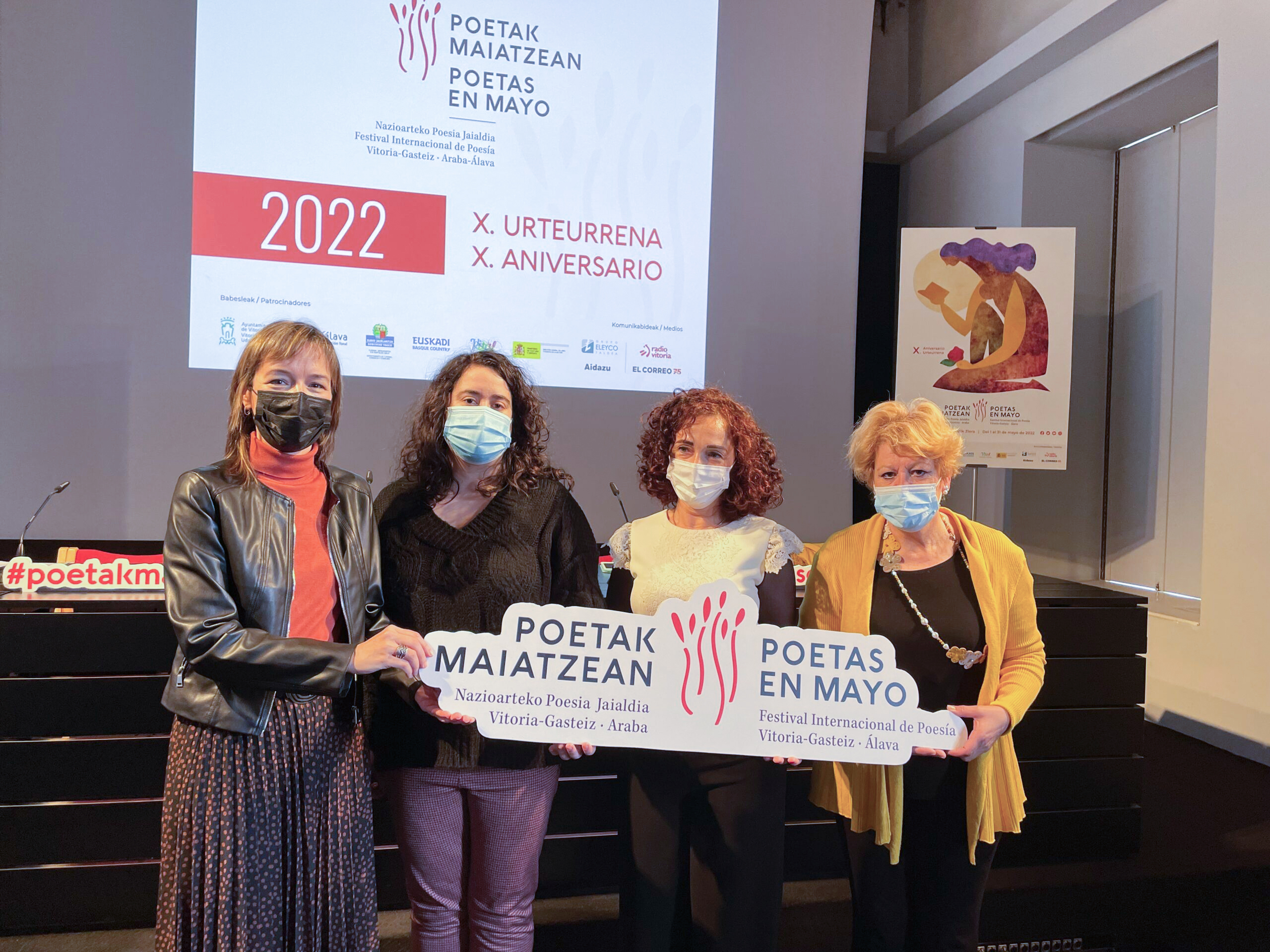 Hilabete baino ez da falta Poetak maiatzean jaialdiaren hamargarren ediziorako, eta aurkezpen ofiziala egin dute gaur, Montehermoso Kulturunean. Bertan izan dira Kultura zinegotzi Estibaliz Canto, Kultura diputatu Ana del Val, Vital Fundazioko zuzendari Arantxa Ibañez de Opakua eta jaialdiko zuzendari Elisa Rueda.