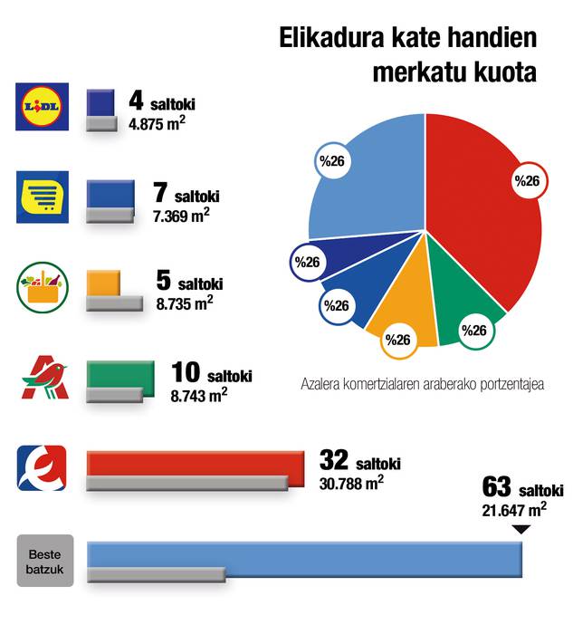 Beste alde batetik, espazioa eta merkatu-kuotaren banaketari begiratuta, Eroski taldeak garaiezina dirudien lidergoari eusten dio sektore lehiakor horretan: 32 saltoki ditu, 30.788 metro koadro okupatzen ditu eta azaleraren araberako merkatu kuotaren %37,5a du. Bigarren eta hirugarren postuetan daude Alcampo taldea eta Mercadona, bakoitzak merkatuaren %10,6ko kuotaren kontrolarekin. Alcampok hamar denda ditu, eta 8.743 metro koadro okupatzen ditu; Mercadonak, berriz, bost supermerkatu ditu eta 8.735 metro koadro.