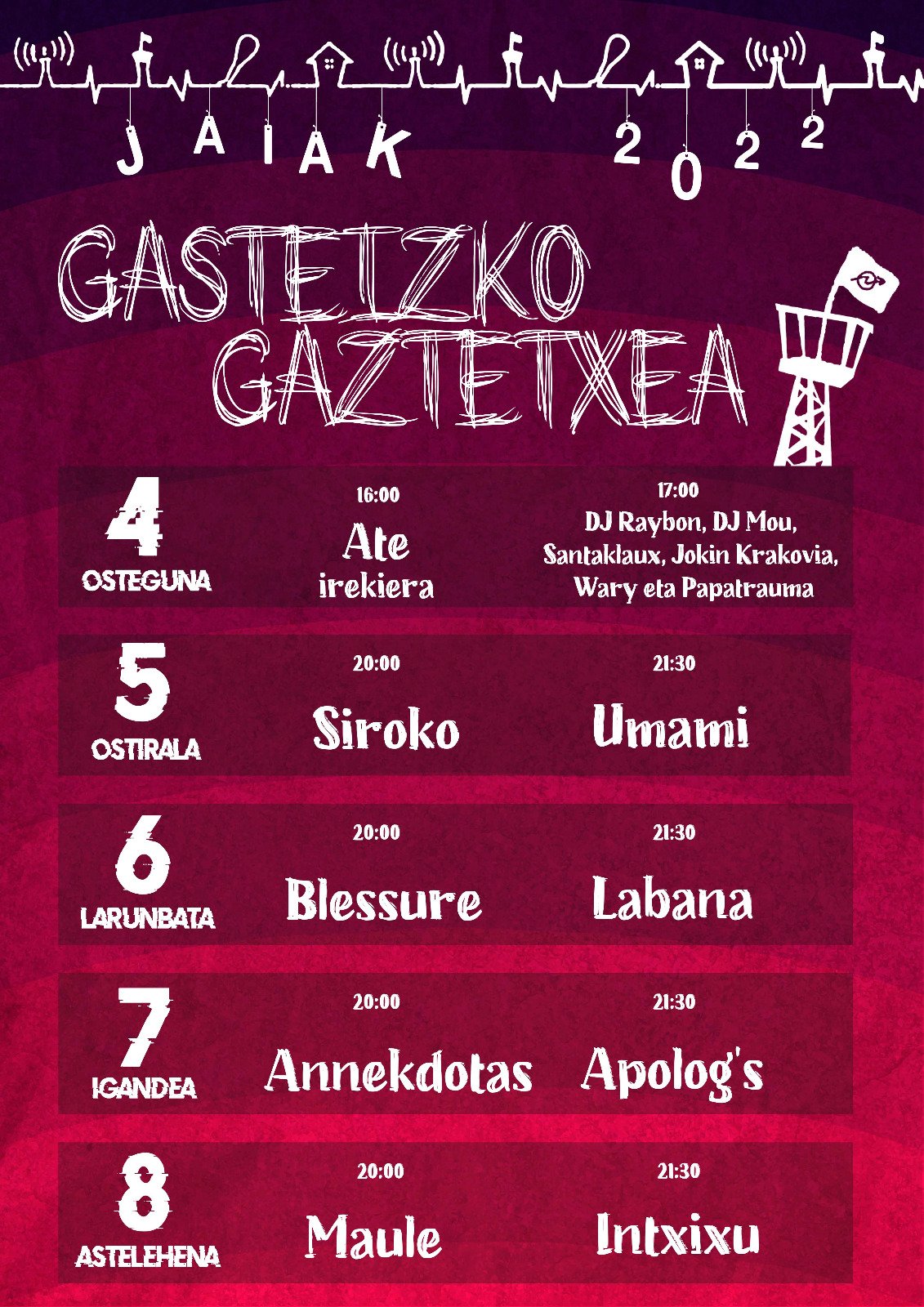 Hemen dira Gasteizko jaiak, eta etenaldi pandemikoaren ostean huts egingo ez duen beste gune bat izango da Gasteizko Gaztetxea. Jaien atarian plazaratu dute abuztuaren 4tik 8ra bitartean luzatuko den eskaintza musikalaren egitaraua.