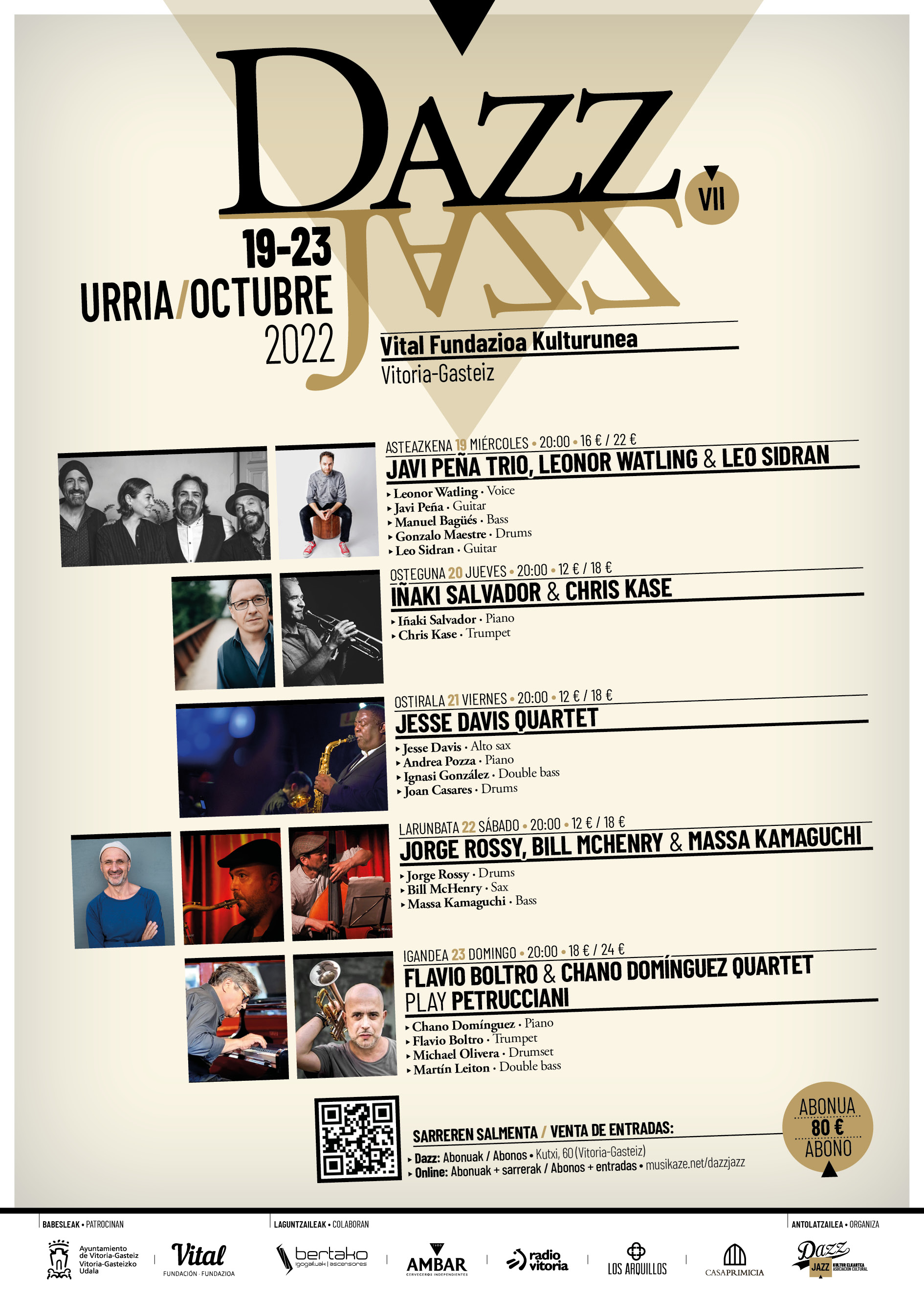 Hamabi egun baino ez dira falta Dazz Jazz jaialdiaren VII. ediziorako. Beste behin ere, Gasteizko jazz zaleek lehen mailako eskaintza batez gozatzeko aukera izango dute Vital Fundazioa Kulturunean, urriaren 19tik 23ra bitartean. Jaialdiaren antolatzaile Beñat Lasagabasterrek, Vital Fundazioko zuzendari Arantxa Ibañez de Opakuak eta Estibaliz Canto Kultura zinegotziak xehetasun guztien berri eman dute gaur goizean, Dazz klubean.