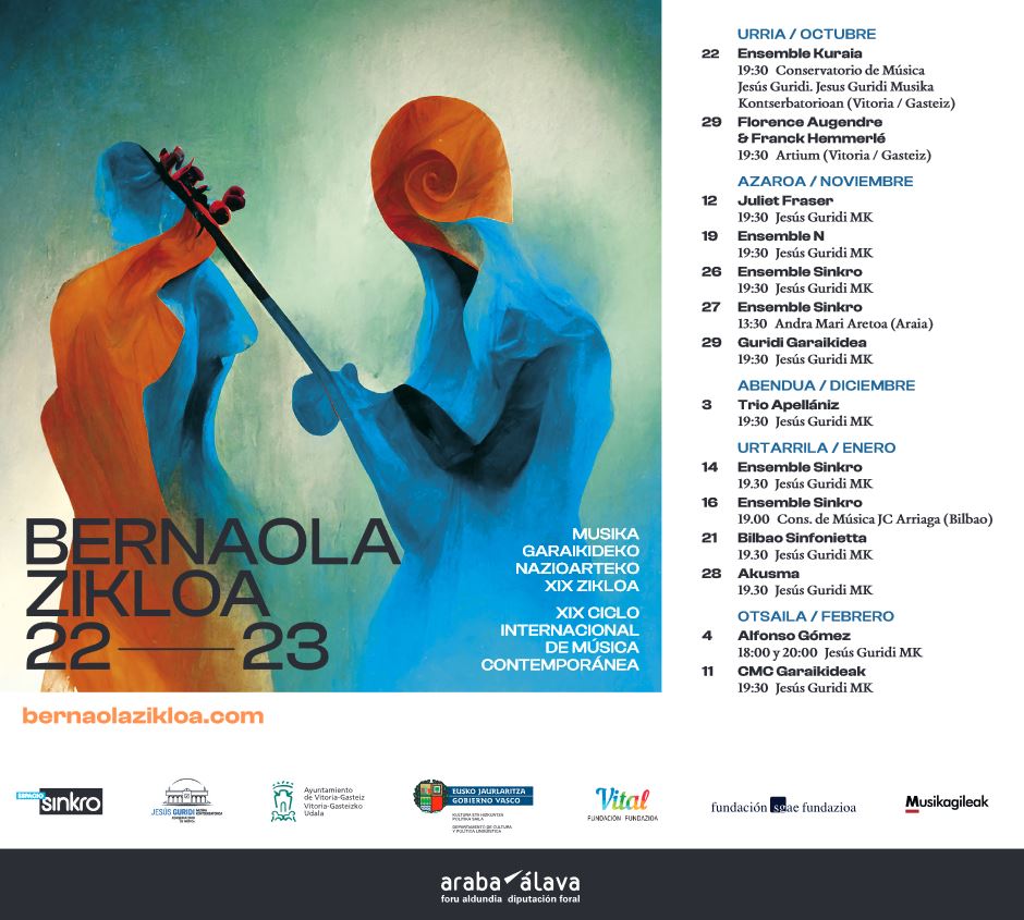 Bueltan da berriz ere Bernaola Zikloa, Musika Garaikideko Nazioarteko Zikloa. Aurtengo edizioa hemeretzigarrena izango da, eta Euskal Herriko, Espainiako estatuko eta nazioarteko artista esanguratsuenen lehen mailako aukeraketa bat eskainiko du, hamalau kontzerturen bitartez, hil honetako 22tik otsailaren 11ra bitartean. Gehienak Gasteizen izango dira, baina zikloa Araia eta Bilbora iritsiko da ere.