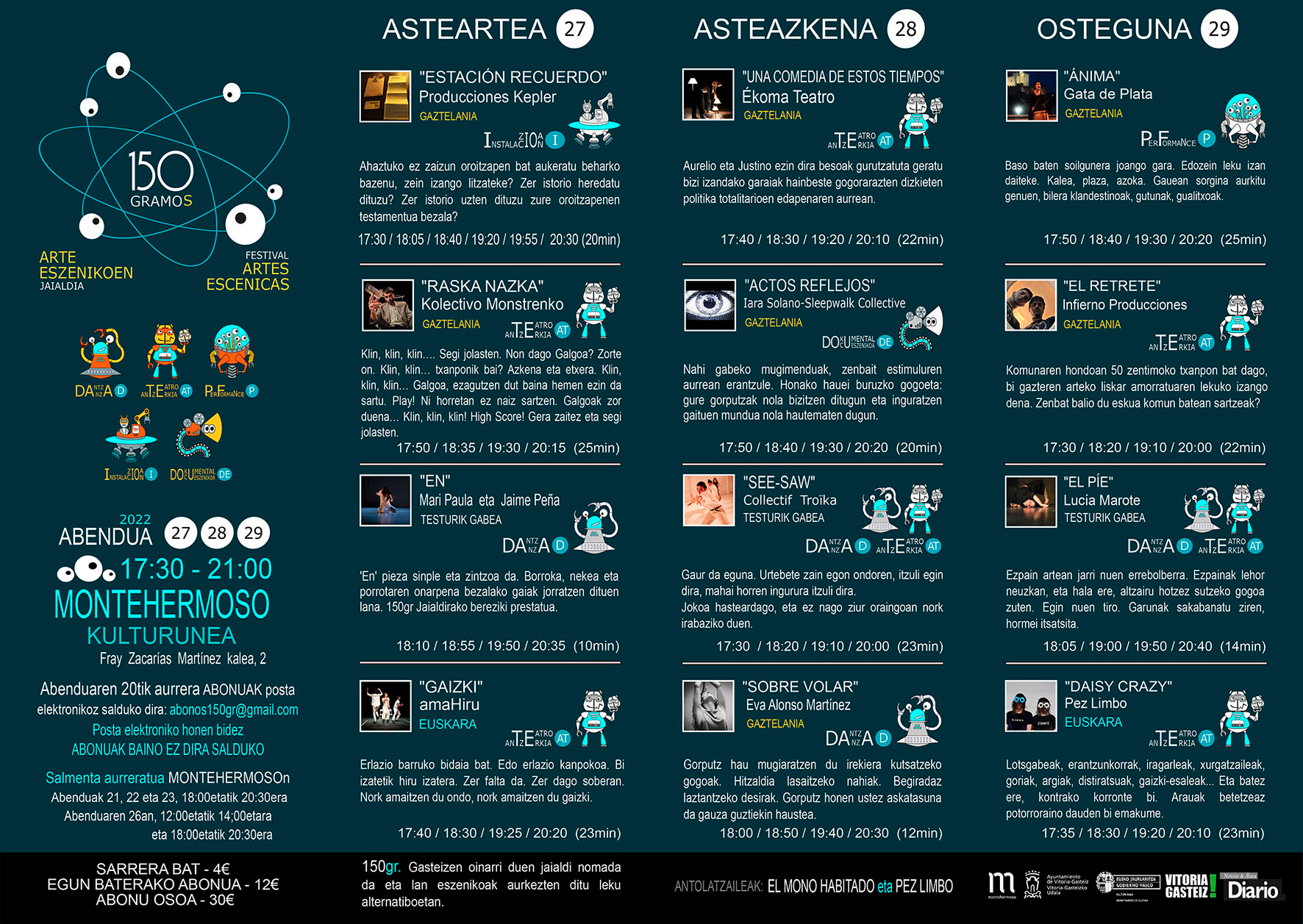 Abenduaren 27an, 28an eta 29an, datorren asteko asteartetik ostegunera, Montehermoso Kulturunera itzuliko da 150 Gramo jaialdia. Aurtengoa XI. edizioa izango da, eta hiru egunez (17:30etik 21:00etara) arte eszenikoetako lan laburrez gozatzeko aukera izango dute bertaratutakoek: antzerkia, dantza, performanceak, instalazioak, dokumentalak...