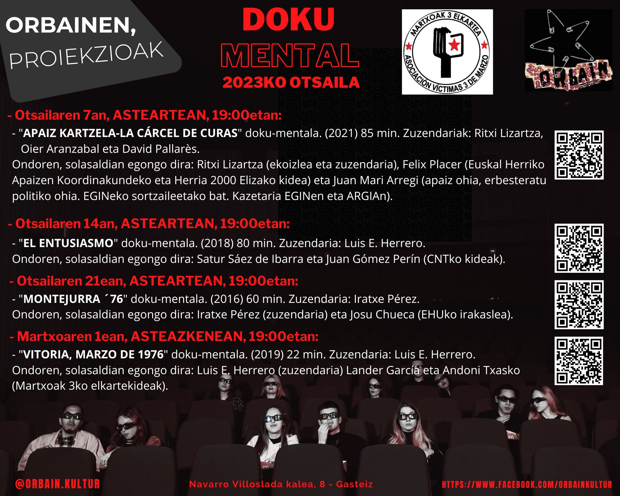 Urte berriarekin batera, Orbain Kultur Elkarteak Doku-Mental zikloa berreskuratuko zuen urtarrilean, eta otsailean ere ikus-entzunezkoak eskaintzen jarraituko dute. Urte osoan zehar (salbuespenekin), asteartero 19:00etan izango dira film eta dokumentalen proiekzioak, Navarro Villoslada kaleko 8. zenbakian kokatutako lokalean.