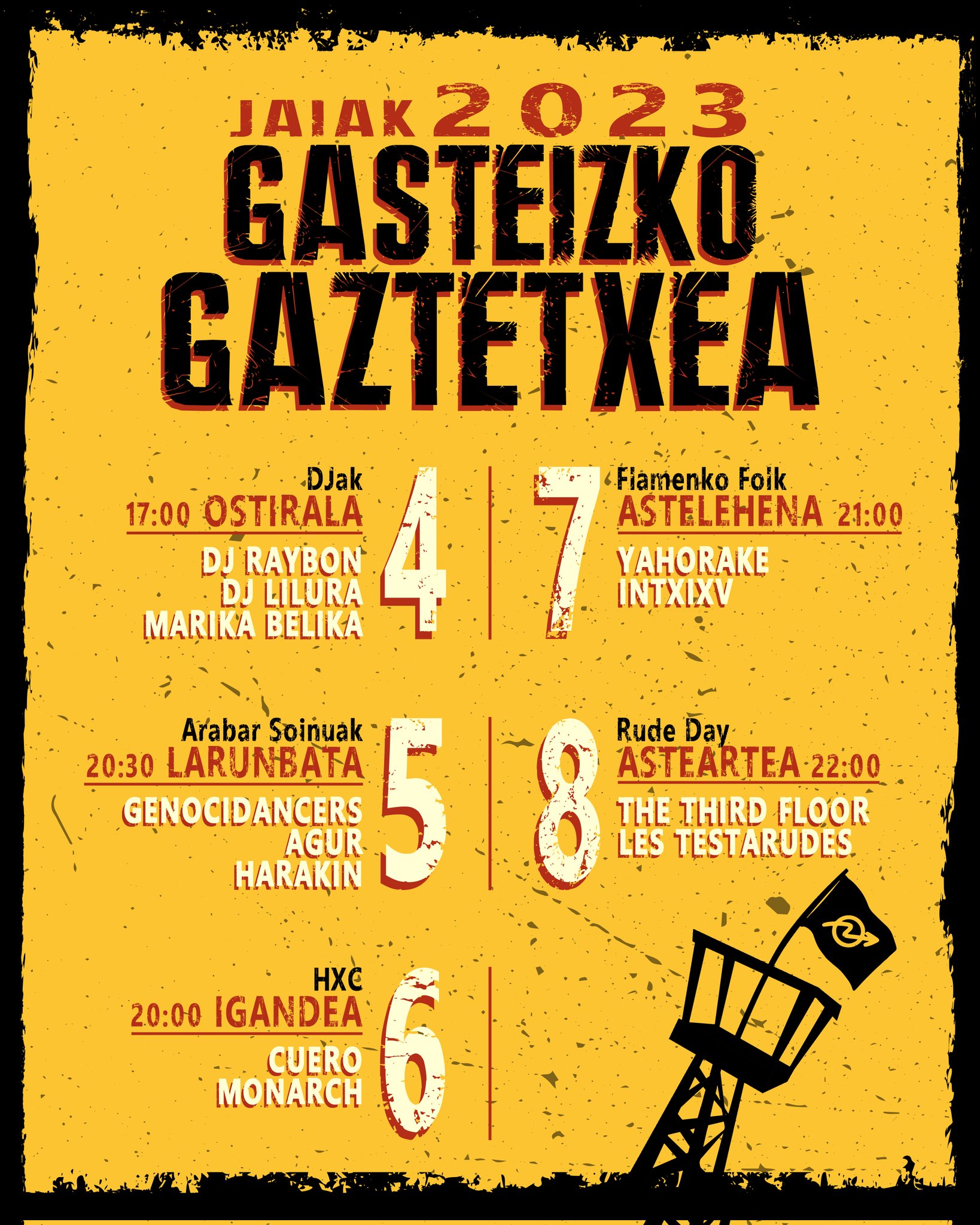Astelehenean, hilaren 7an, Flamenko Folk eguna antolatuko dute Gaztetxean, 21:00etatik aurrera, Yahorake eta Intxixv taldeen eskutik. Jaietako azken egunean atseden hartu aurretik, asteartean, abuztuaren 8an, azken bi kontzertuak izango dira, Rude Day egunean, 22:00etatik aurrera: The Third Floor talde gasteiztarrarekin batera, Les Testarudes katalanak izango dira, soinu jamaikarrak lau haizetara zabaltzen.