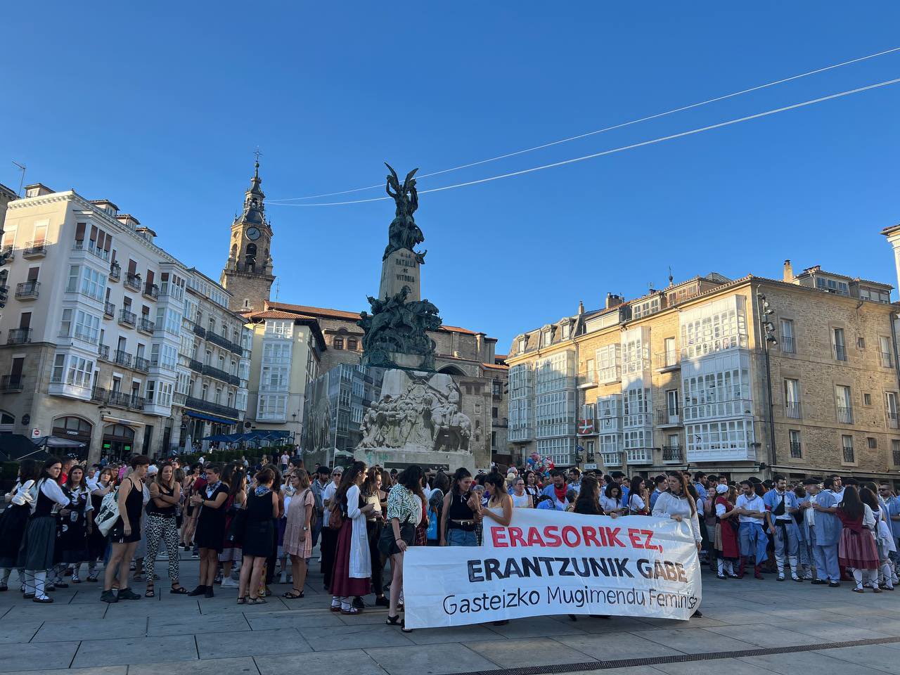 Gasteizko Mugimendu Feministak deituta, elkarretaratzea egin dute Andre Maria Zuriaren plazan jaietan izan diren eraso matxistak salatzeko. Erasorik ez erantzunik gabe lelopean, dozenaka lagun elkartu dira astearte arratsaldean plazan.