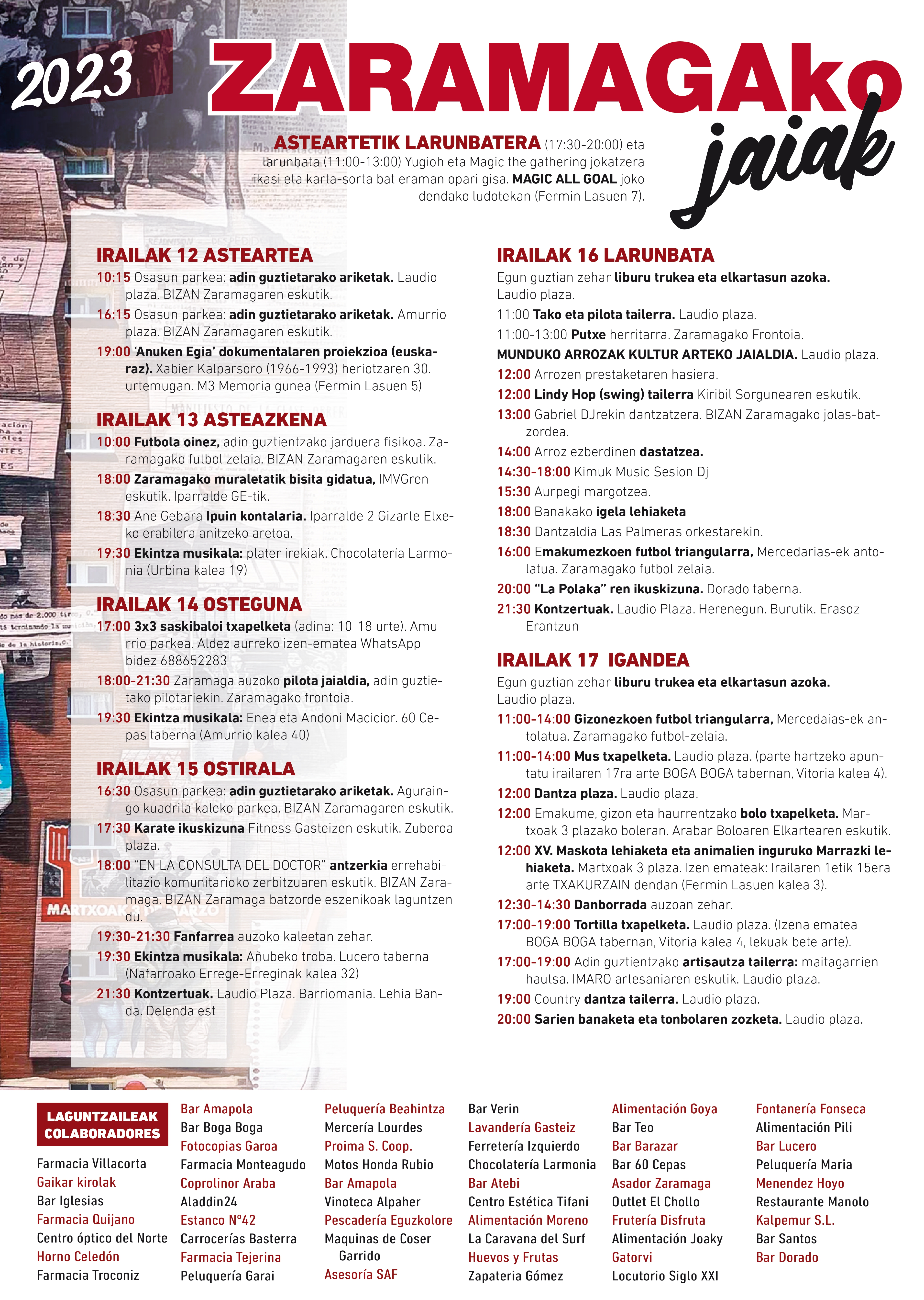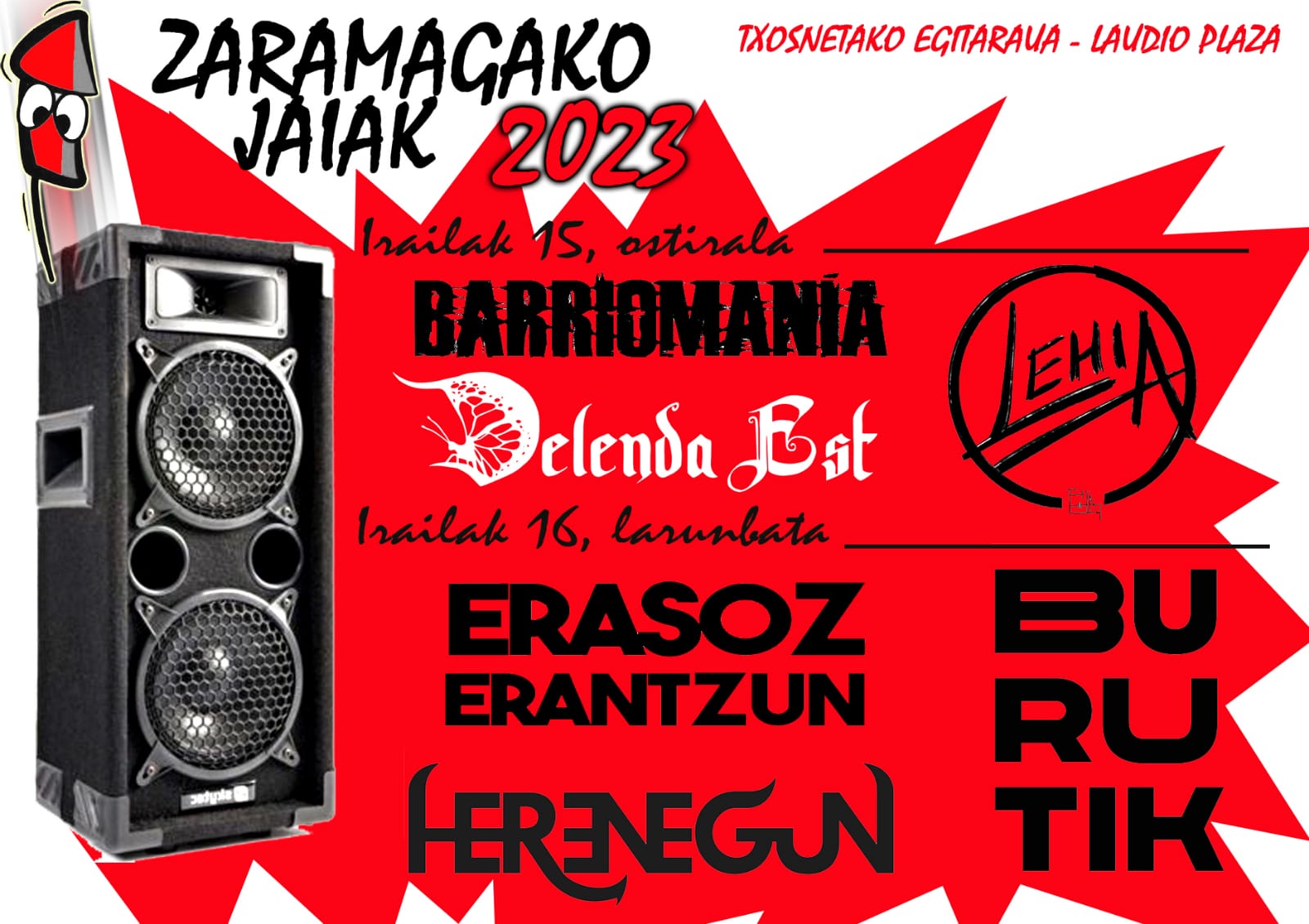 Iazko kokapen aldaketaren ostean, txosnagunea Laudio Plazan jarriko dute aurten ere, Belengo Andre Mariaren parrokiaren, Zaramagako futbol zelaiaren eta Koldo Mitxelena ikastetxearen parean. Bertan izango da asteburuko festa handia: ostiralean, irailaren 15ean, 21:30etik aurrera Barriomania, Delenda Est eta Lehia taldeen kontzertuekin; eta larunbatean, 12:00etatik aurrera Munduko Arrozak nazioarteko ekimen gastronomikoarekin, eta 21:30etik aurrera Erasoz Erantzun, Herenegun eta Burutik taldeen emanaldiekin.