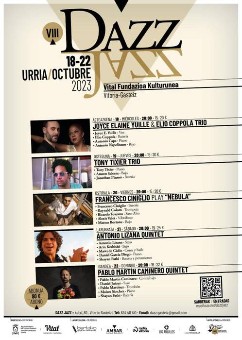 Bueltan da Dazz Jazz jaialdia. Urriaren 18tik 22ra bitarte, bost kontzertu eskainiko ditu Gasteizen jazz musikan erreferente bilakatu den tabernak. Ohi moduan, Vital Fundazioaren aretoan izango da jaialdia, Dendaraban.