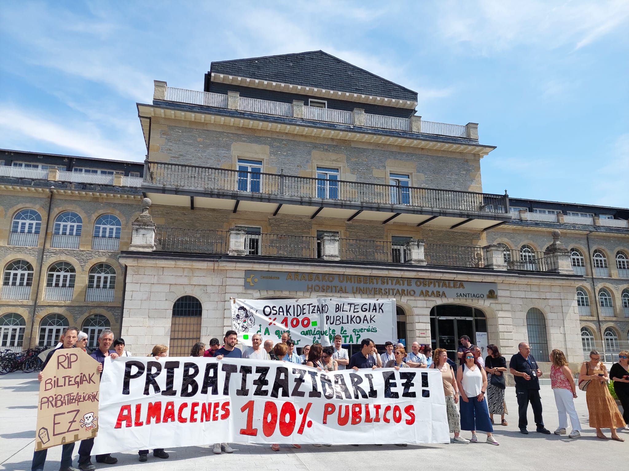 Osakidetzako langileak protestan ari dira Gasteizen eskatzeko biltegi zerbitzua %100ean publikoa izan dadila. Joan den asteazkenean Txagorritxuko langileek egin zuten bezala, aste honetan Santiagokoek egin dute elkarretaratzea, ELA, LAB, CCOO eta ESK sindikatuek deituta. Salatu dute Iurretan eraikitzekoa den plataforma logistikoak Osakidetzaren "desegite eta pribatizazioa sakondu" egingo duela.