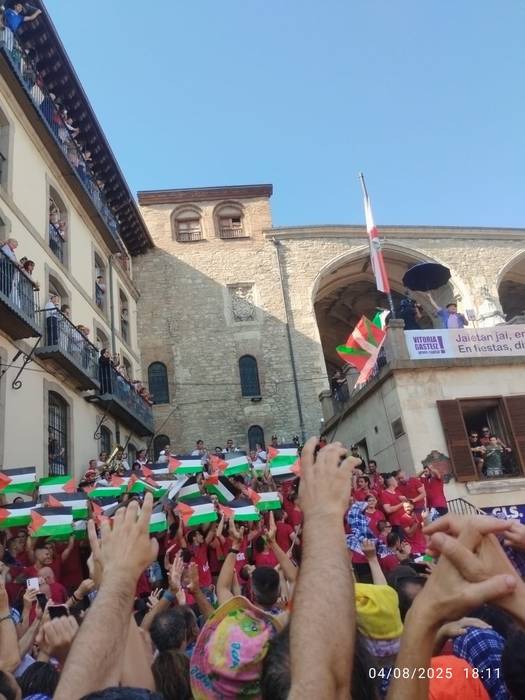 Palestinaren aldeko eta genozidioaren aurkako mezuek toki berezia izan dute aurtengo txupinazoan. Gasteizko jaien hasieran Palestinako banderaz betea egon da Andre Maria Zuriaren plaza, BDZ taldeak antolatutakoak batzuk, eta hiritarrek eramanak beste asko. Neska eta Blusen elkarteko ehun kidek Palestinako banderak zabaldu dituzte San Migeleko eskaileretan.