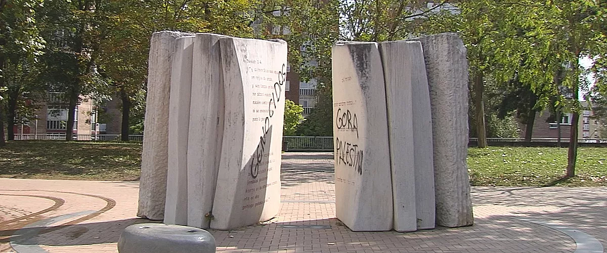 Judimendiko parkean kokatutako eskulturari eraso egin diote asteazken honetan, Israel Gazan egiten ari den genozidioaren aurkako eta Palestinaren aldeko mezuak margotuta. Hamas, hil itzazu, Genozidak eta Gora Palestina mezuak agertu dira juduen hilerriaren gainean eraikitako oroitarrian.