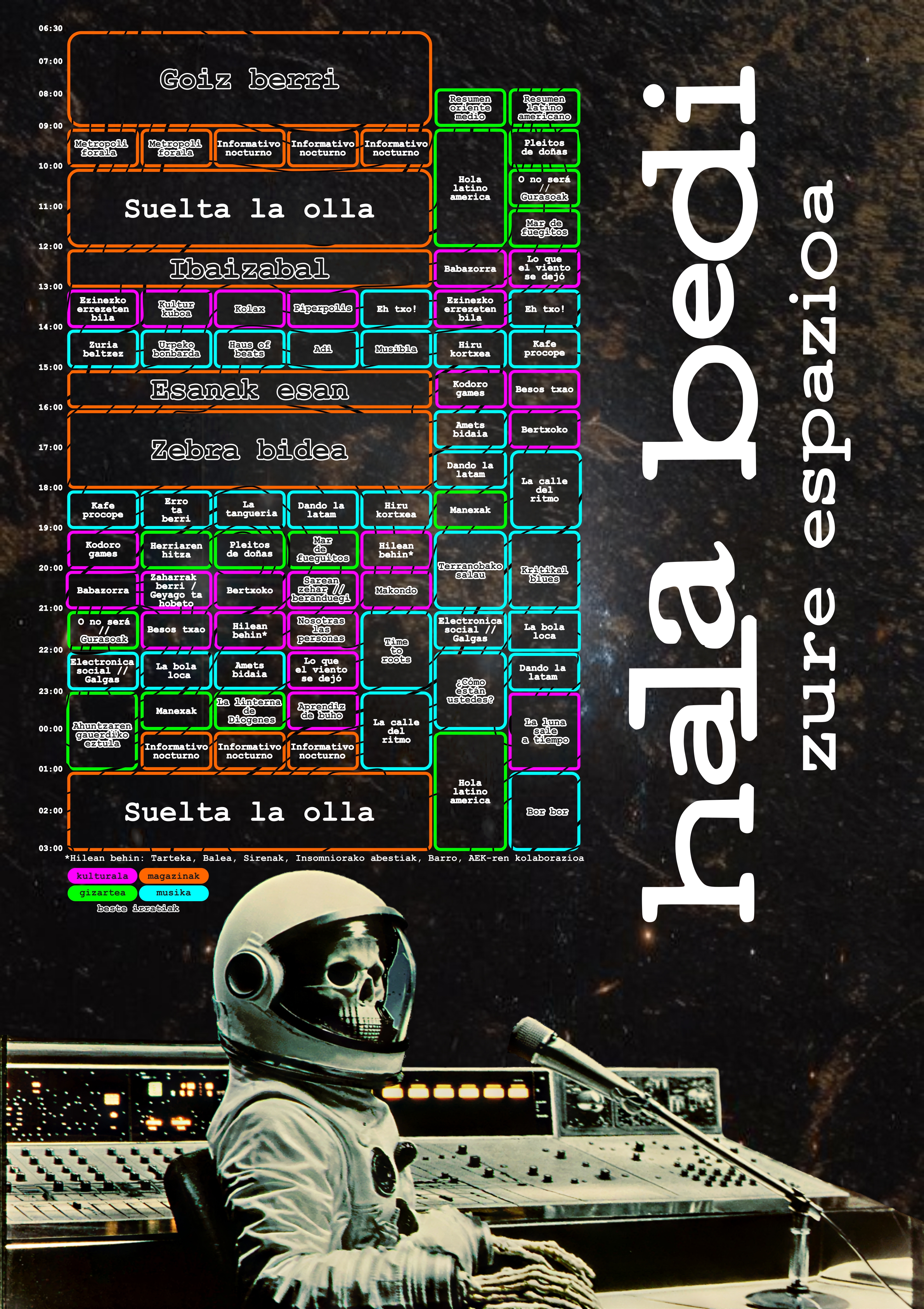 Urtero bezala, programazio berria du Hala Bedi irratiak, eta jendaurrean aurkeztu du larunbat honetan, urriaren 25ean. Aiztogile kaleko Hala Bedi Tabernan egin dute Parrillada, irratsaio zaharrak eta berriak elkartuta.