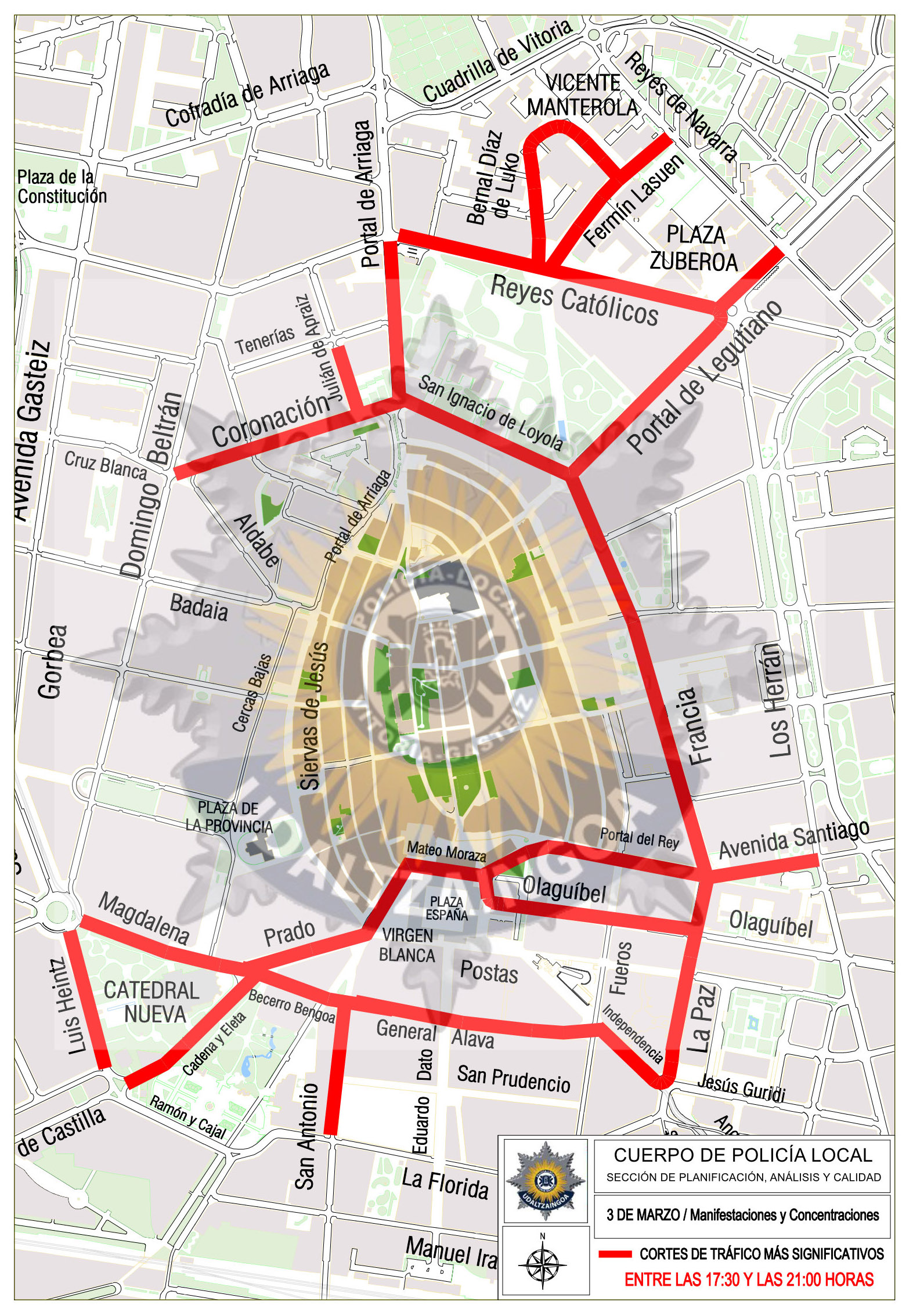 Gasteizko Udaltzaingoak dispositibo berezia jarri du martxan Martxoaren 3ko sarraskiaren 50. urteurreneko ekitaldiak direla eta. Hiriguneko sarbide nagusiak trafikoari itxiko zaizkio bi txandatan: goizez (11:00etatik 13:30era) eta arratsaldez (17:30etik 21:00etara), aurreikusitako manifestazioek segurtasun eremua izan dezaten.