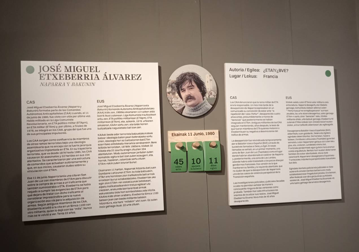 Absentzia presenteak. Espainian terrorismoak desagerrarazitakoak izeneko erakusketak estatuan inoiz aurkitu ez dituzten terrorismoaren sei biktimak gogoratzen ditu, horien artean Etxeberriarena. Asteartean inauguratu zuen memorialak.