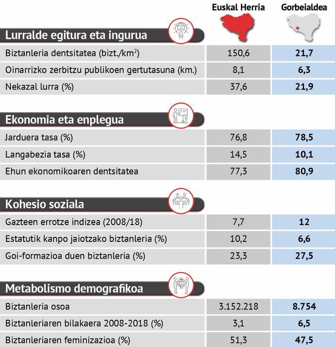 XX. mendearen bigarren erdialdean jazo zen despopulazio joera garrantzitsuari egokien eutsio dion udalerria Legutio izan da, hiriburuaren iparraldean garatzen den industria ehunetik gertu kokatzen baita. Gerora, azken hiru hamarkadetan, Gorbeialdeko egitura demografikoa Gasteizko eta beste eremu batzuetako herritarrak bereganatzearekin indartu da. 45 eta 64 urte bitarteko (eta formazio eta errenta maila ertain-altuko) biztanleria xurgatzeko gaitasuna izan du. Ildo horretan, haurren presentzia indartsua da (%16,0); 15 eta 29 urte bitarteko gazteen presentzia, ordea, ahulagoa da (%13,0); 30-44 urte bitarteko herritarren presentzia ere mugatua da; eta azkenik, 65 urtetik gorako herritarren presentzia (%21,6) Araban edo Euskal Herrian baino murritzagoa da. Gaindegiak egindako ikerketan nabarmendu dutenez, "belaunaldi ordezkapena indartzeko etxebizitza politikak aktibatu ezean, epe ertainera egoera bestelakoa izan daiteke". Izan ere, gailentzen den eraikuntza motaren eraginez, etxebizitza hiriburuan eskuragarriagoa gertatzen da, eta bertara jotzen dute herritar askok.