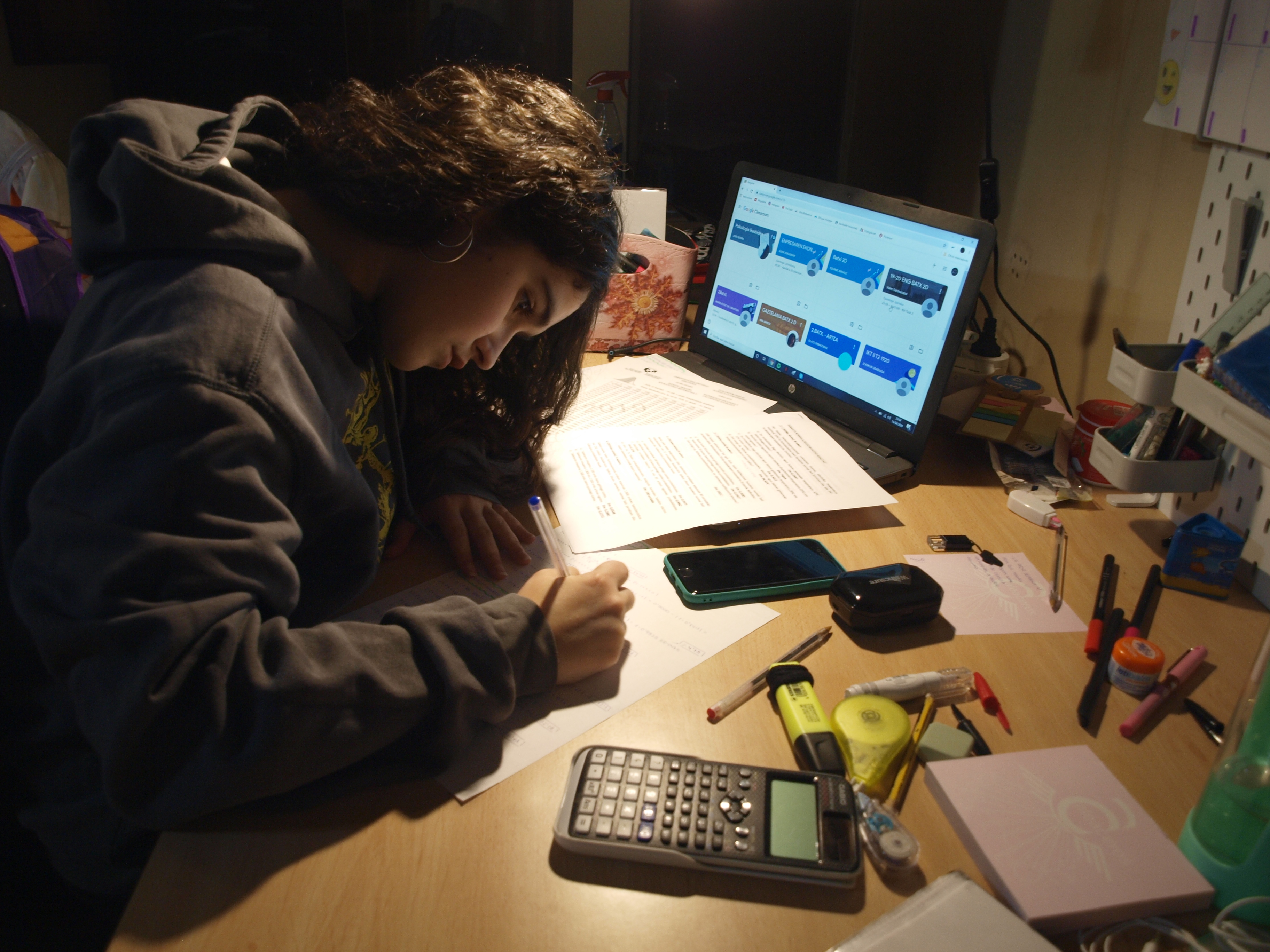 Izugarria da, selektibitatea egin behar dugulako nahi eta nahi ez. Hasieran, txantxa moduan hartu genuen, baina denborarekin konturatu gara kontua serioa dela. Martxotik ikasteke dugun materiala guk bakarrik atera behar dugu aurrera, eta askotan ez dakigu hori guztia nola maneiatu. Egoera horri gehitu behar zaio batzuetan ez dugula irakasleen laguntza. Dena dela, ez da ohikoena. Tutorea, esaterako, gure gainean dago beti, egunero dago guri mezuak bidaltzen.