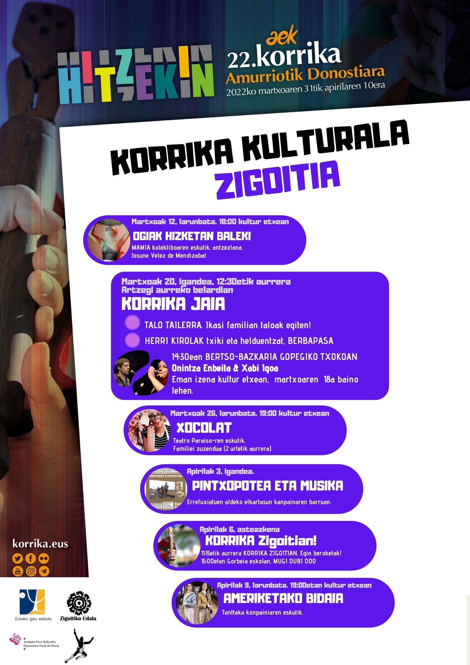 Martxoaren 31tik apirilaren 10era bitartean, Euskal Herria zeharkatuko du 22. Korrikak. Aurretik, baina, hitzordu mordoa antolatzen ari dira herriz herri, Korrika Kulturalaren barruan: Gasteiz, Trebiñu... eta, oraingoan, Zigoitian ere egitarau zabala iragarri dute Korrika Batzordeak eta Udalak.