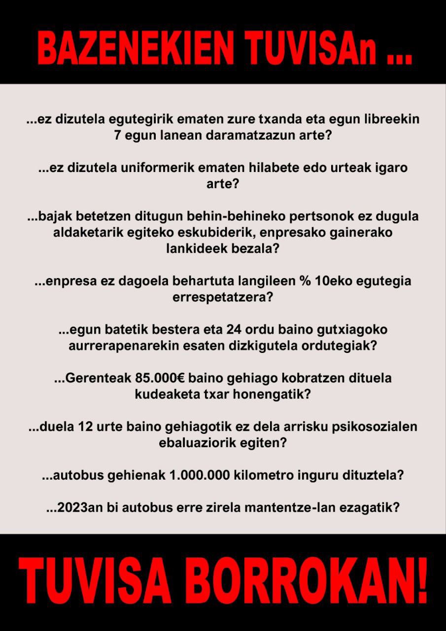 Argi gera dadila hau ez dela kapritxo bat. Egoera honetara iritsi gara plantilla osoaren nazka mailagatik: gure lanaldiak ez betetzeagatik (jardunaldi osoa zenbatuko duen erloju bat nahi dugu); autobusen baldintzengatik; berrikusi ez diren lineetako ordutegi irreal eta zaharkituengatik...