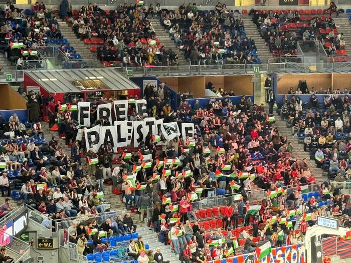 Indar Baskonia taldeko kideek, gainera, elkartasun performance ikusgarria burutu zuten pabiloira sartzearekin batera, eta hizki-mosaiko baten bidez Free Palestine leloa osatu zuten, ordezkaritza israeldarrarekiko gaitzespena eta Palestinarekiko elkartasuna argi adierazteko.