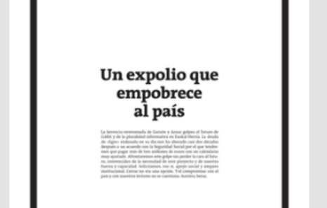 Kazetariak euskal herritarrei, zuri, laguntza eske agertu dira. Zer egin? Zuk ez duzu egunero kazeta irakurtzen, beraz, ez zaitu zuzenean eragiten. Zuk lagunduta ere, itxi nahi badute itxiko dute. Aurrekariak ikustea besterik ez dago. Oraingoan, baina, herriari, zuri, zuzenean zuzendu dira. Beste alde batera begiratuko al duzu? Hemendik urte batzuetara, gertatzen dela gertatu ere, atzera begiratzean amore eman zenuela esan nahi duzu? Tamalez, ongi dakizu zer nolako sentimendu garratzak eragiten dituen komunikabide baten itxierak. Bidea, beraz, erraza da: beste behin mendeku zentzugabe baten aurrean herritarrok aurrea hartu behar badugu, ala izan dadila. Ez dakizu zer gertatuko den, baina ongi dakizu porrot bakarra ez saiatzea litzatekela.