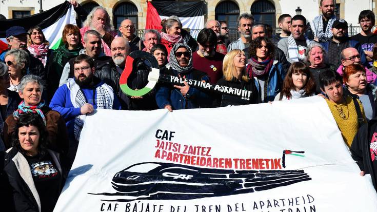 CAF enpresa beasaindarrak Israelentzat eraiki behar duen trenaren aurka mobilizatu ziren larunbatean Gasteizen. Israelek Palestinan ezarritako legez kanpoko koloniak Jerusalemgo hirigunearekin lotuko ditu tren horrek.
