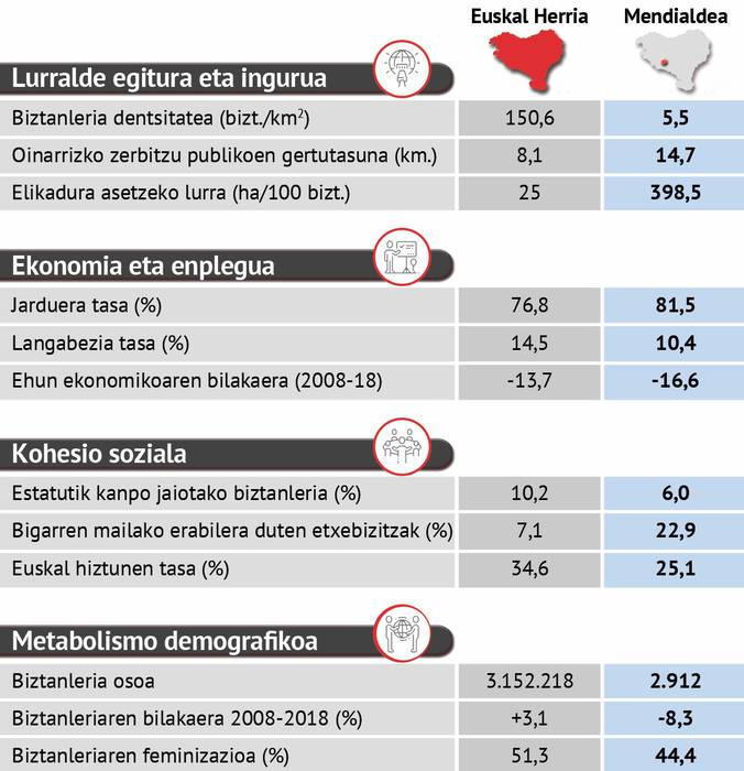 Horrekin batera, ehun ekonomiko ahula duen eskualdea da, eta horrenbestez, "bizitza proiektuak modu integralean garatzeko" aukera gutxi eskaintzen ditu Mendialdeak, eta "aspaldian hiriburuarekin lehiatu ezinean dabil".