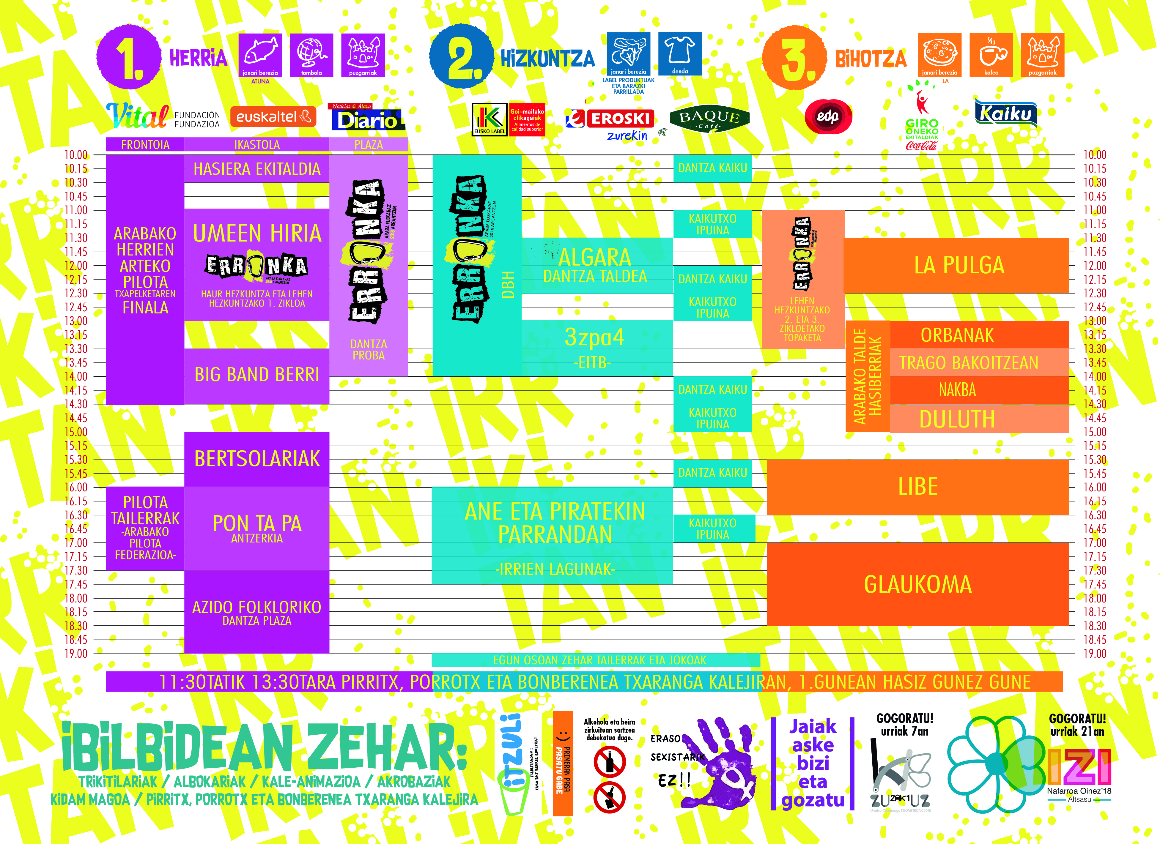 Libe, La Pulga edota Glaukoma bezalako talde ezagunez gain, herrialdeko talde hasiberriak ezagutzeko aukera egongo da: Orbanak, Trago Bakoitzean, Nakba eta Duluth dira horiek. Pirritx, Porrotx eta gainerako irrien lagunak Bonberenea txarangarekin batera ibiliko dira, gune batetik bestera, giroa alaitzen. Horrez gain, halako festa batean ezinbestekoak diren osagaiek beteko dute eguna: trikitilariak, bertsolariak, pilotariak, dantza plaza, antzerkia...haur zein helduen gogoa asetzeko moduko egitaraua, beraz.